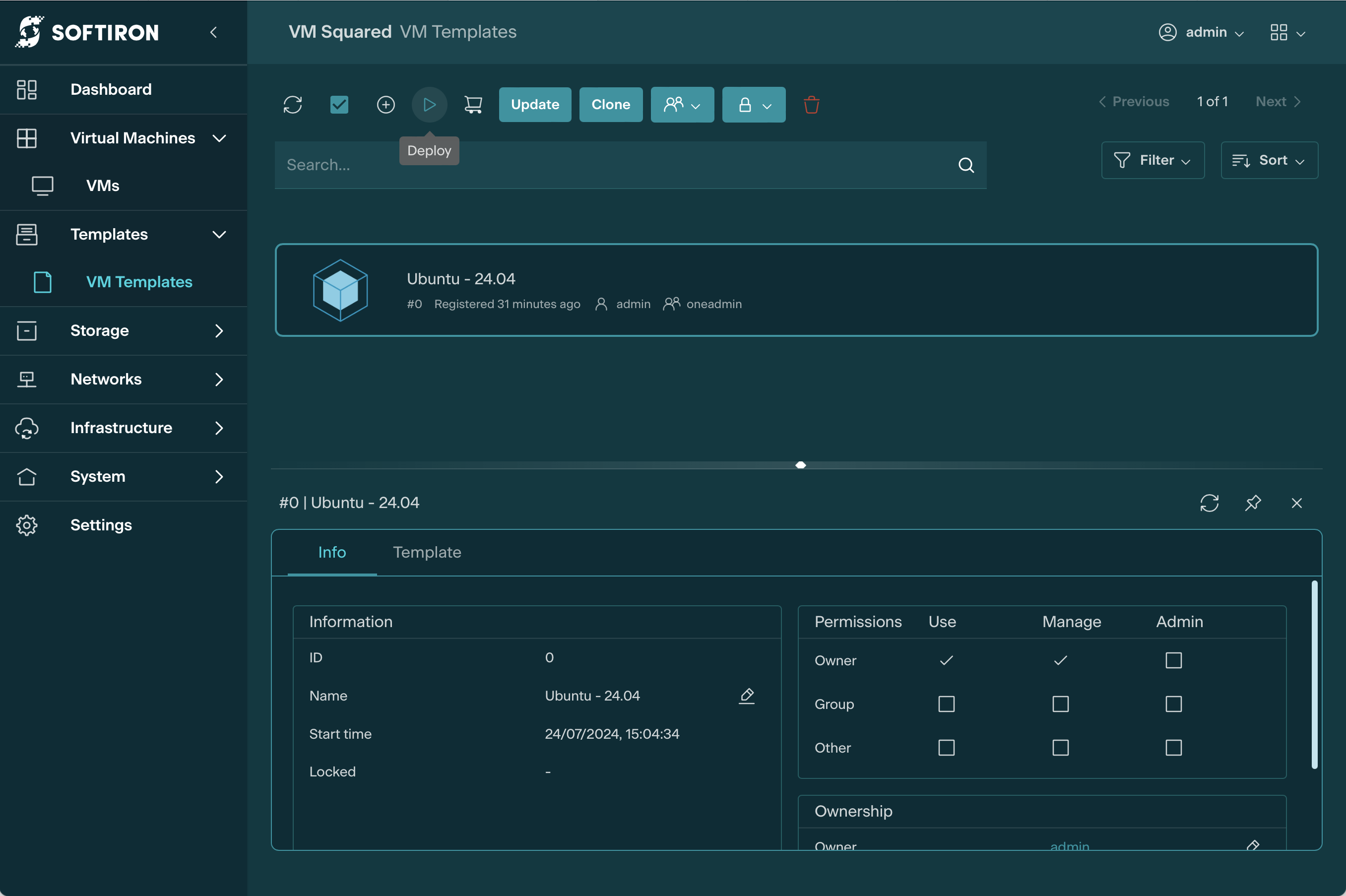 1. To create a VM instance, navigate to the VM Templates, select the new template, and click on the Deploy button.