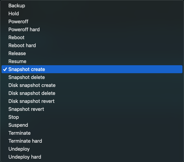 The nomenclature of the commands is such that, snapshot-create refers to the creation of the full VM Snapshot and a disk-snapshot-create refers to a specified disk snapshot that can be converted to an Image that will be saved in the Datastore.