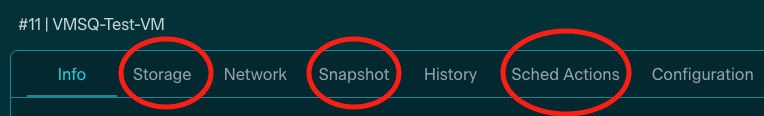 There are several ways of taking and managing snapshots within the GUI and via the CLI. After selecting a VM from the list of running Instances, there will be several tabs of information available to select and view and/or modify. The Storage, Snapshot, and Sched Actions tabs contain the actionable options for the snapshots.