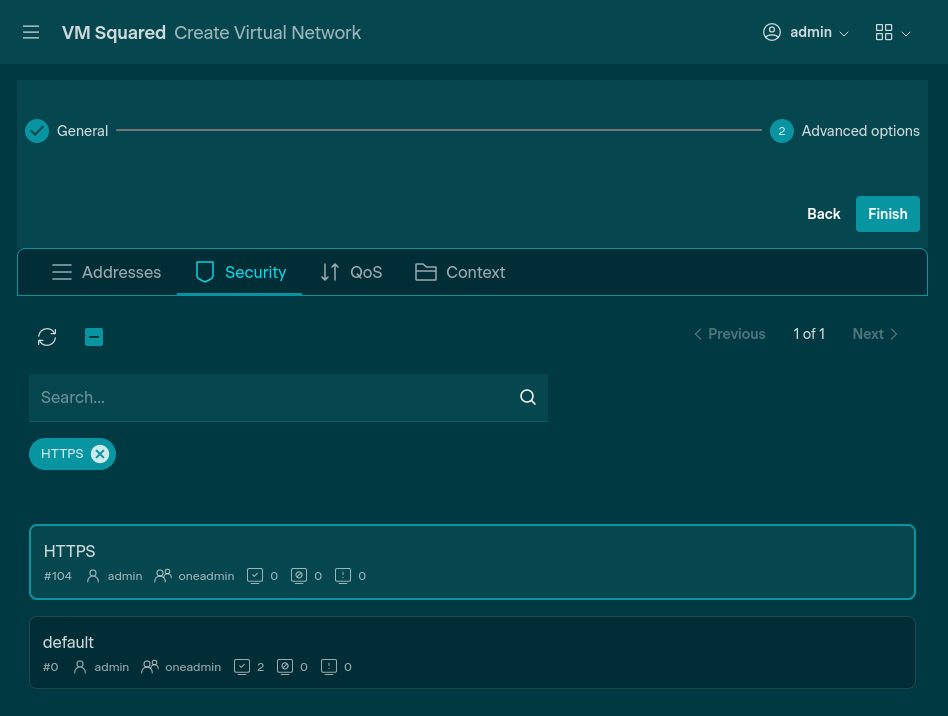 Select one or more Security Groups to apply to this Virtual Network. The resulting firewall rules are an additive combination of all selected Security Groups, so avoid "Allow All" groups if you intend to restrict network traffic.