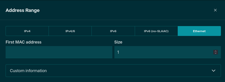 • IPv6 - Only IPv6 SLAAC addresses are assigned Creating an IPv6 Address Range
