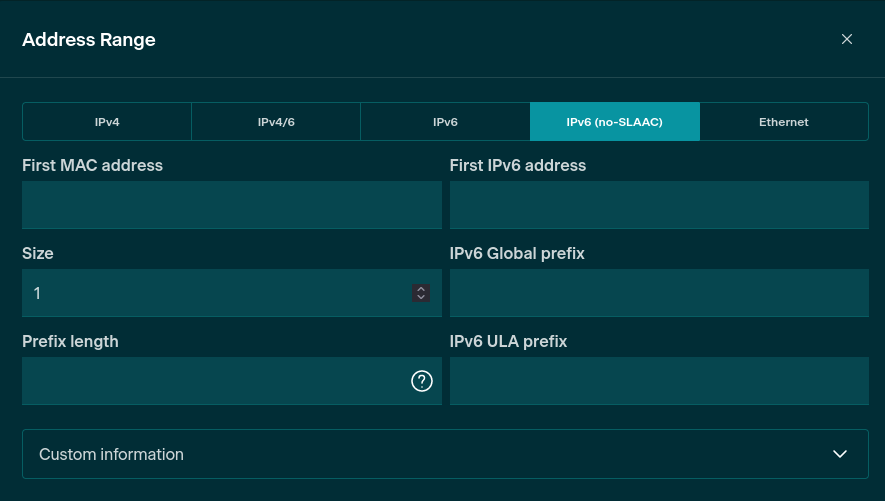 • IPv6 (no-SLAAC) - Only fixed non-global IPv6 addresses are assigned Creating an IPv6 local Address Range
