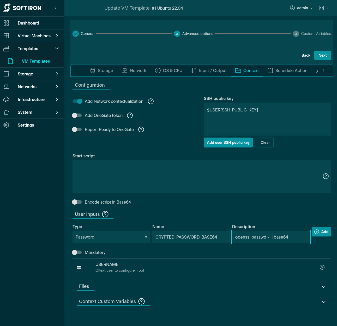 When deploying the VM Template, since additional template context was added, there will be an extra step for User Inputs, this is where the password data is entered for the VM.