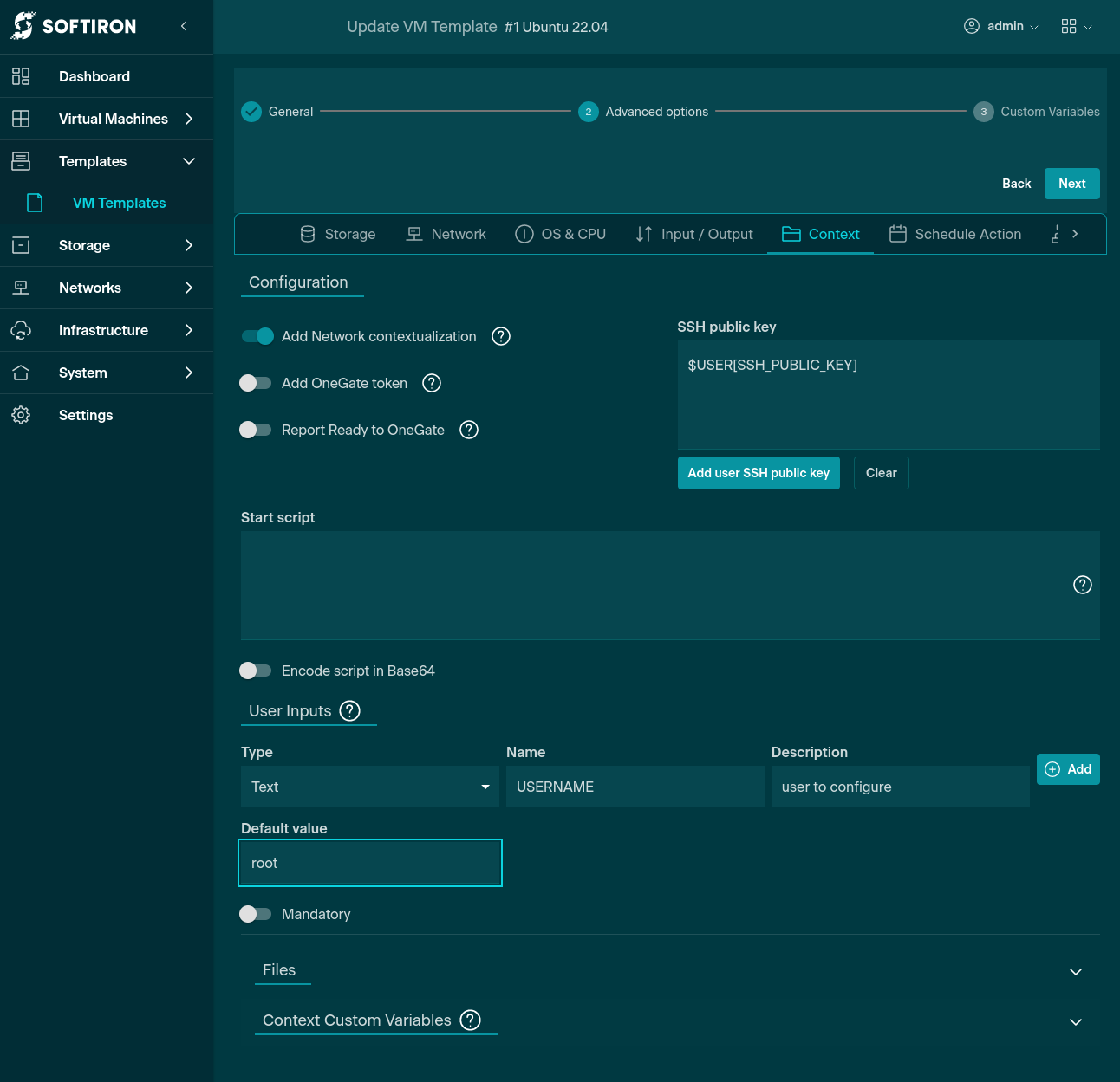 In the User Inputs section, create two new fields. First, add a field with Name USERNAME, the Input type: "Text", and the default value of the user that will receive the context during instantiation. Click Add before moving on to the next field. The Default value field is optional, but will need to be provided a value before deploying the VM.