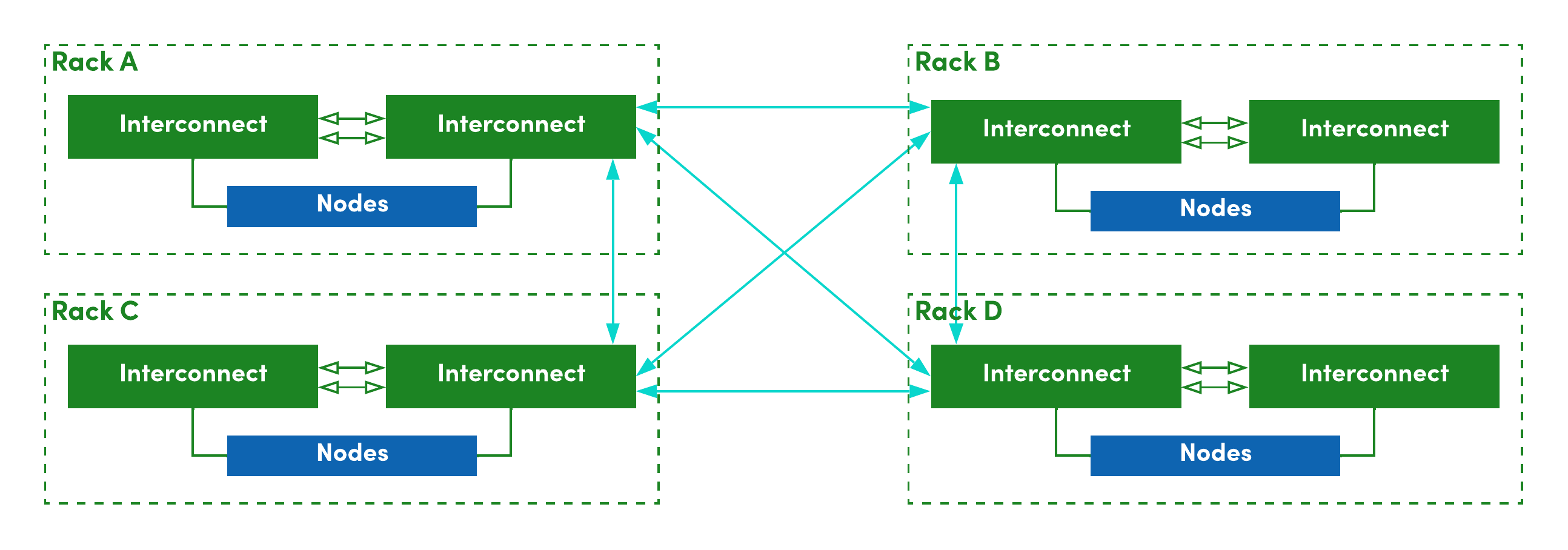 Once the architecture begins to span multiple racks, the network configuration will be a full mesh architecture for maximum resilience. Full mesh is sustainable across a number of racks - once deployment scale exceeds a certain critical mass, it moves to a leaf-spine architecture.