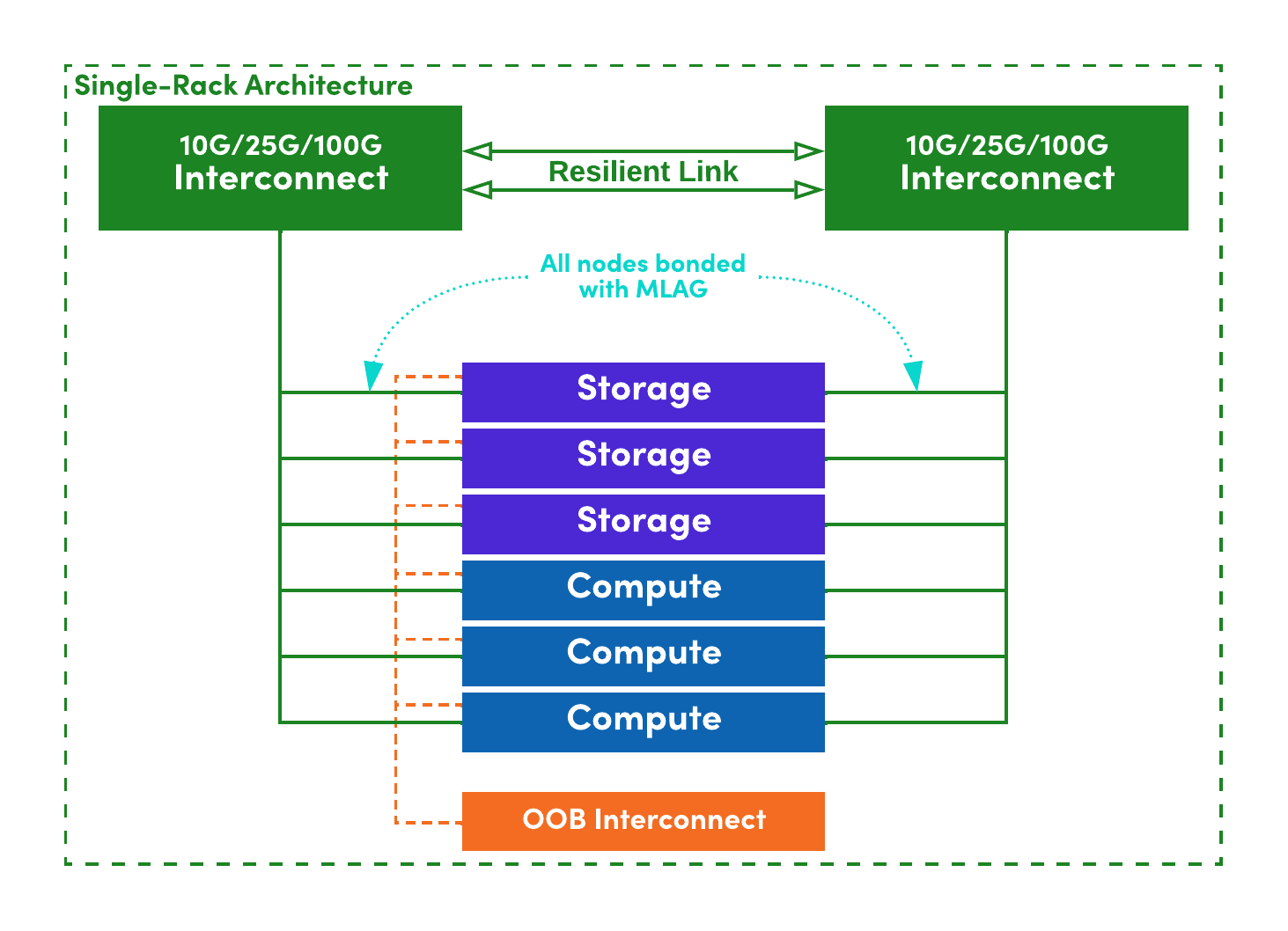 Within the confines of a single rack, the HyperCloud networking configuration will almost always look the same. It will consist of multiple interconnect nodes - these encompass both ethernet networking and out-of-band networks. The interconnect nodes use redundant links between each other and the compute and storage nodes.
