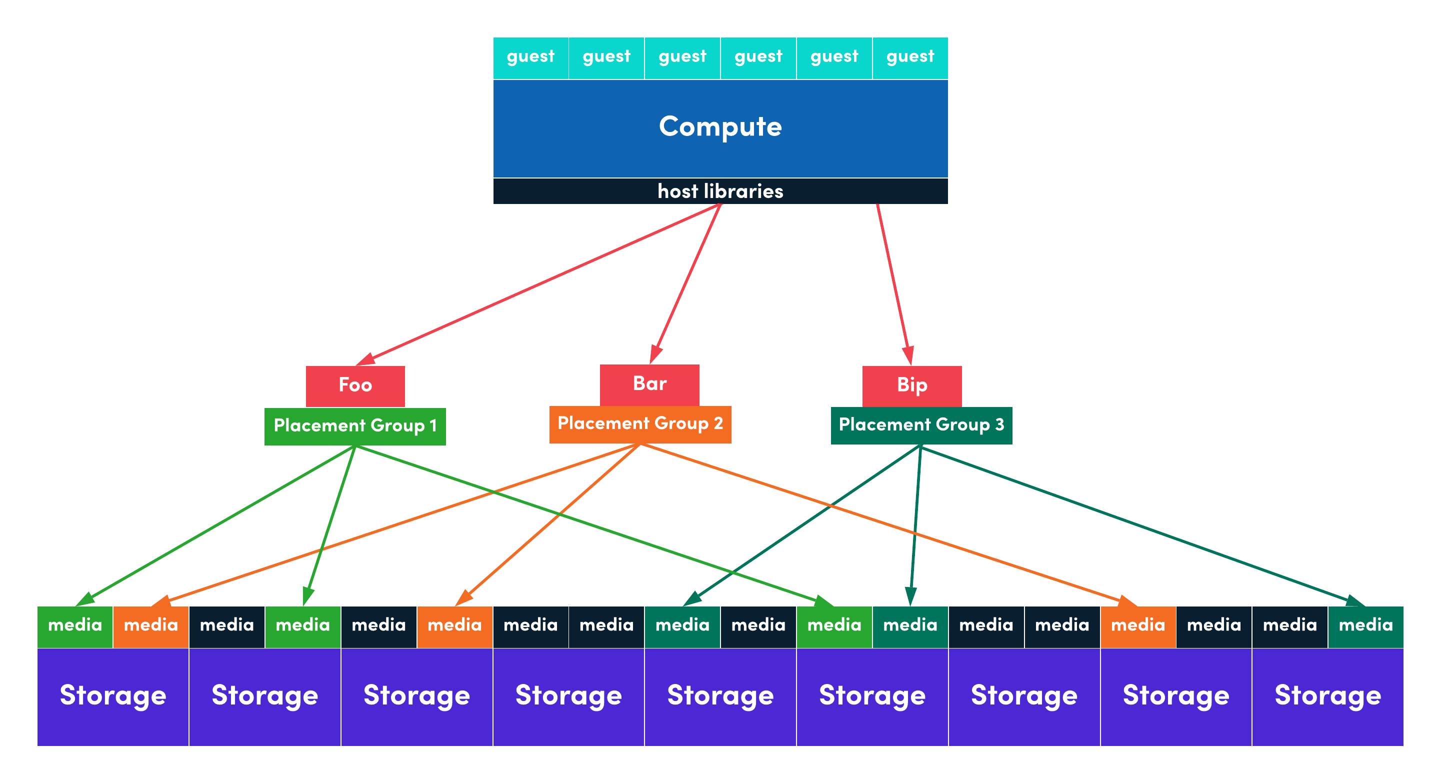 All data placed in the storage layer is stored in an abstraction layer which ensures data is evenly spread across storage media and can be addressed with different rulesets. This also means that recovery from media failure is very quick, as additional replicas are not created on a single other media, but in the abstraction layer itself, and therefore on all media.