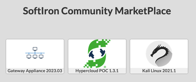 As seen in the Accessing SoftIron Marketplaces page, there are several marketplaces supported by SoftIron, which contain various Appliances and Images to be used within HyperCloud to create Templates and devices to use within the cloud infrastructure. Access to these marketplaces requires authorization and can be granted via an e-mail to support@softiron.com.