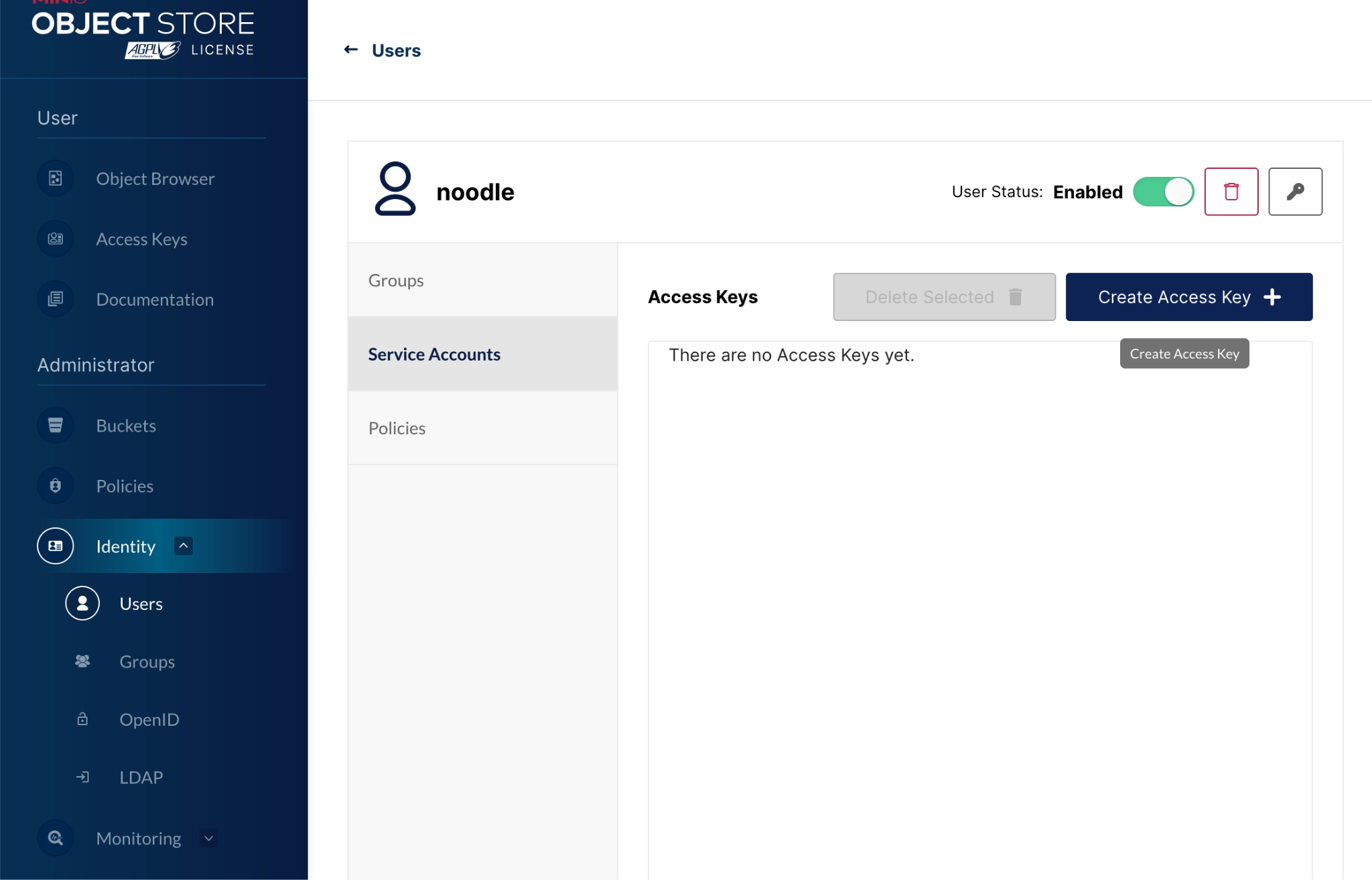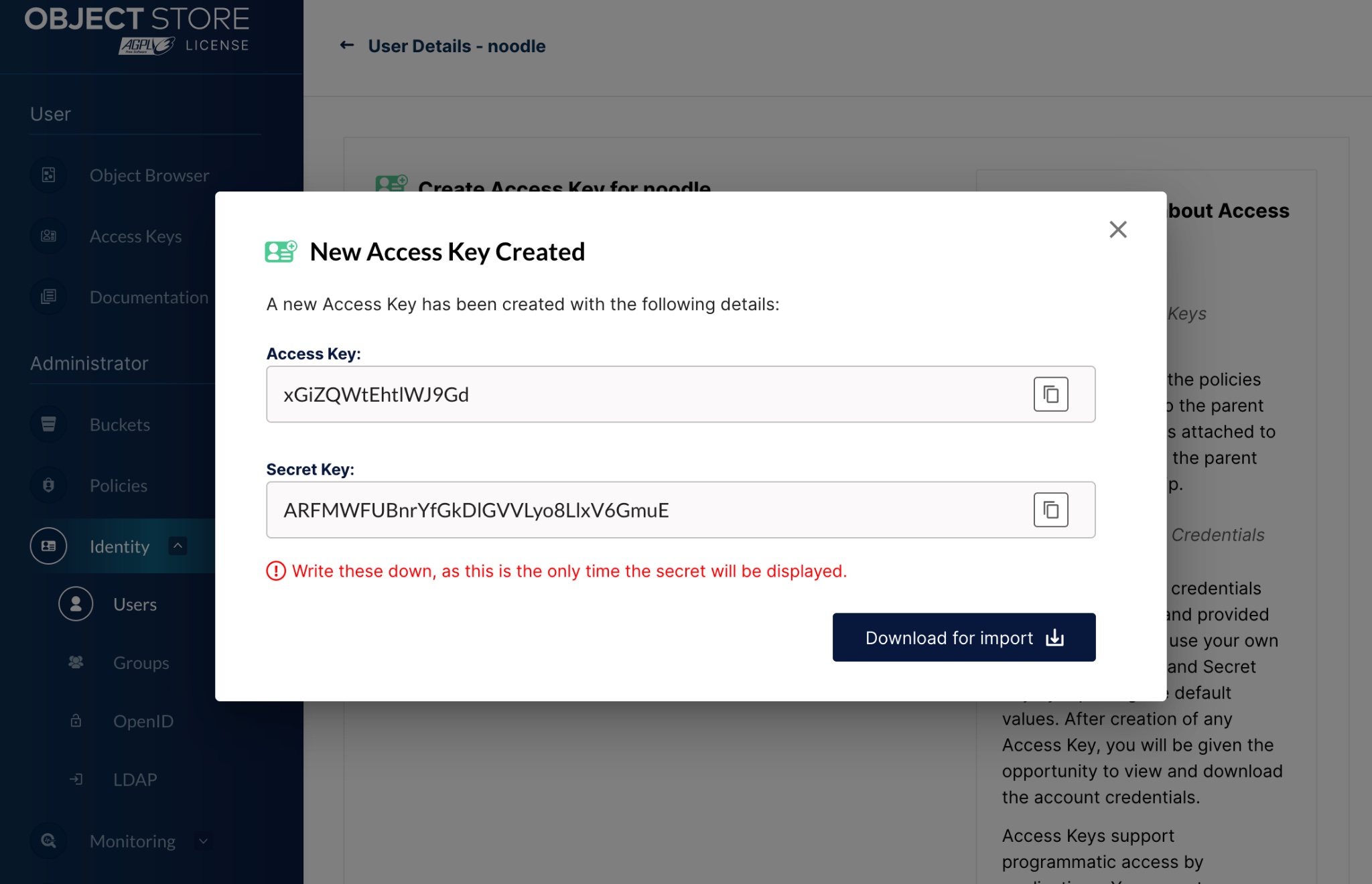 Create Access Key for user. This will create an Access Key and Secret - the secret will only be shown once during this creation process but there is an option to download it. It can not be recovered if it is not recorded or saved at this point. The Access and Secret Keys can now be loaded into the client's ~/.s3cfg file.