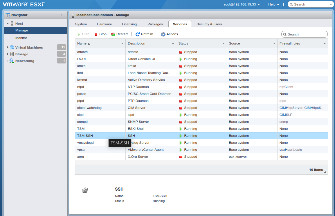 Start by logging into your ESXi deployment, then look under Host > Manage to confirm “TSM-SSH” is running. If not, follow the product’s instructions for enabling the service.