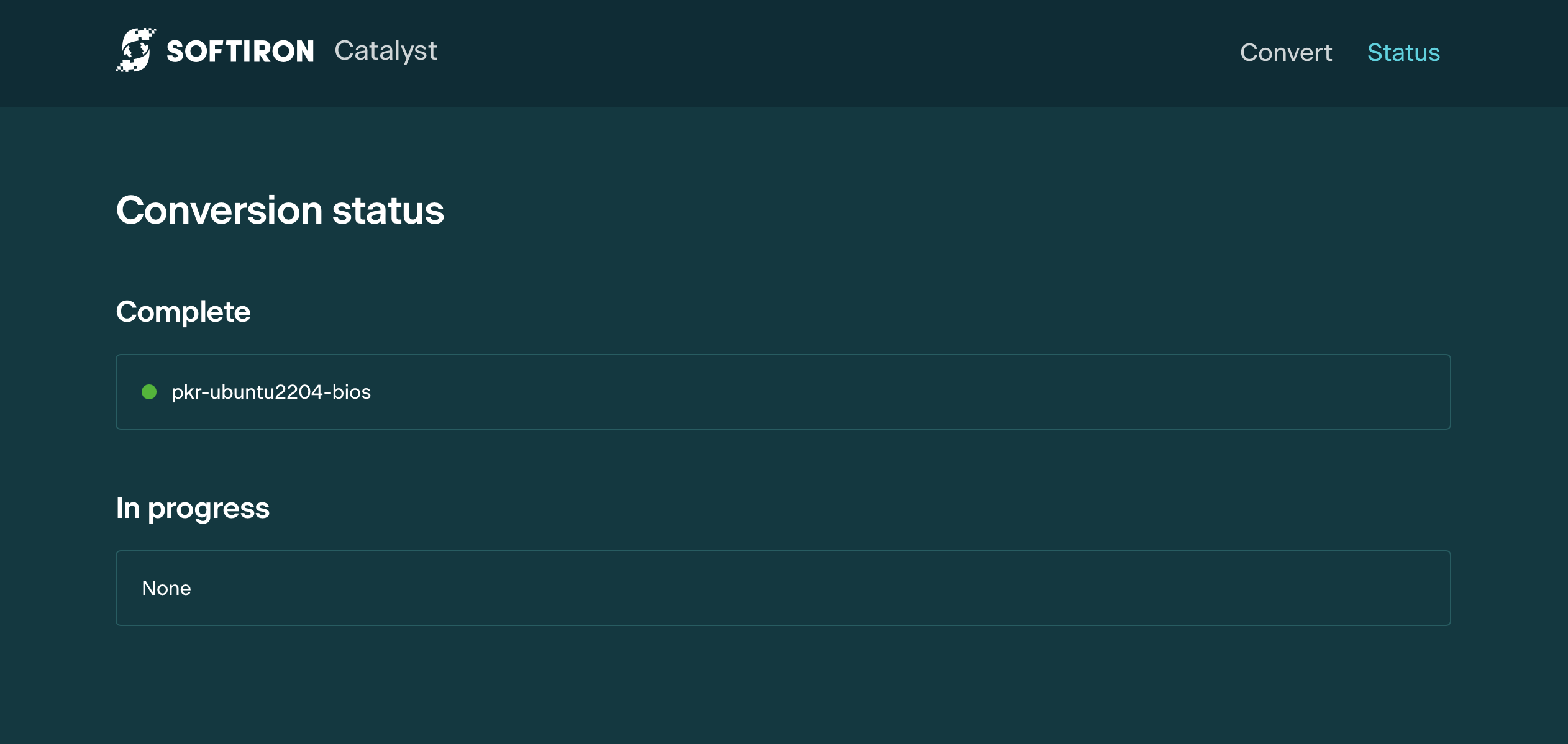 Catalyst through a browser has two main views:: Convert and Status.
