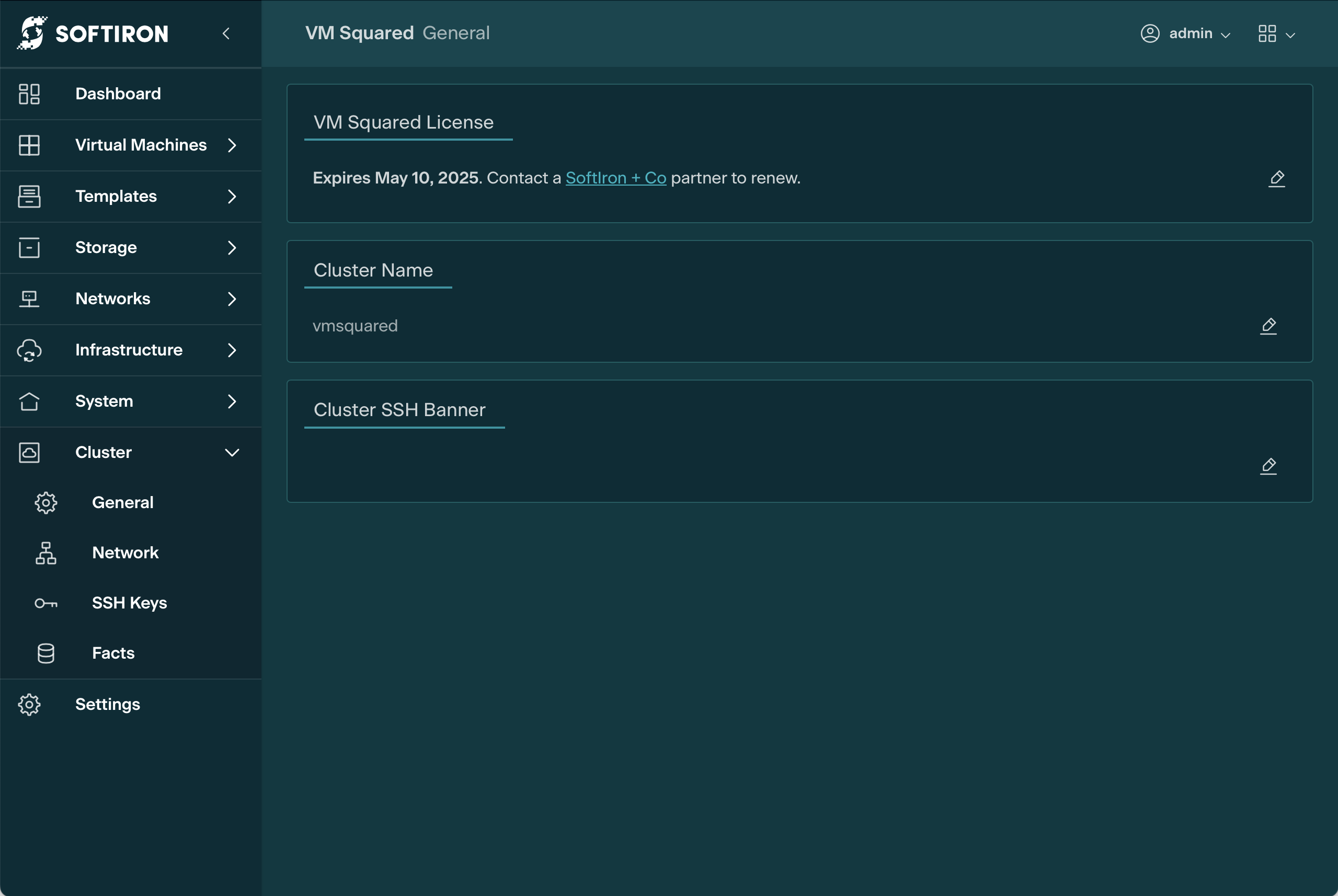 To update the VM Squared License navigate to the Cluster/General panel in the Glasshouse GUI.