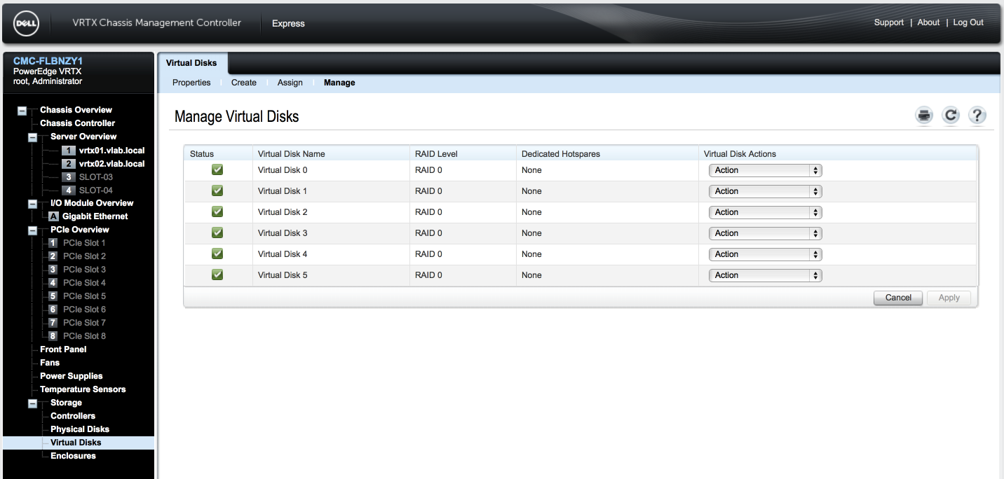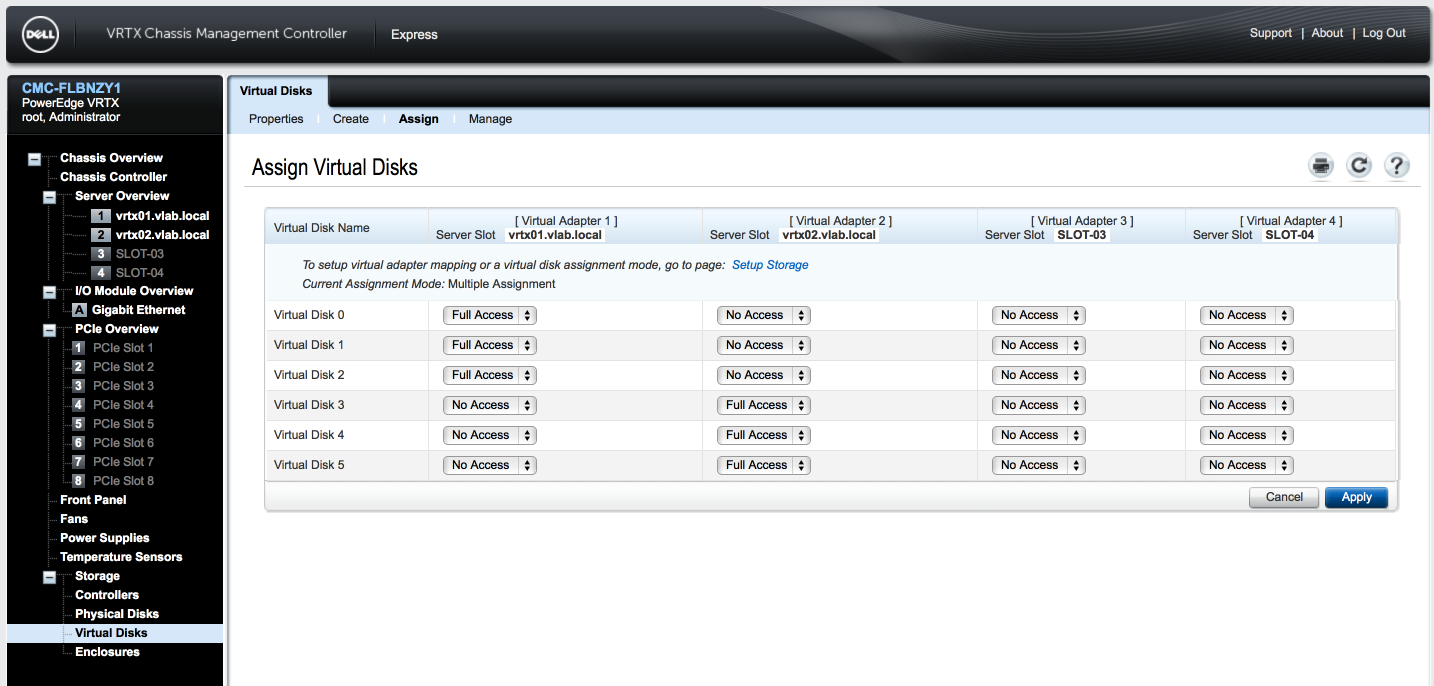 In this example we have a Dell PowerEdge VRTX with chassis-based shared PERC8 Controller. This example of a system with RAID grouping and LUN mapping is analogous to FC and iSCSI shared storage systems.