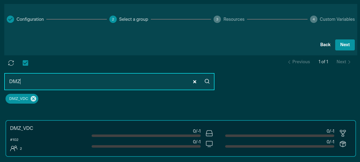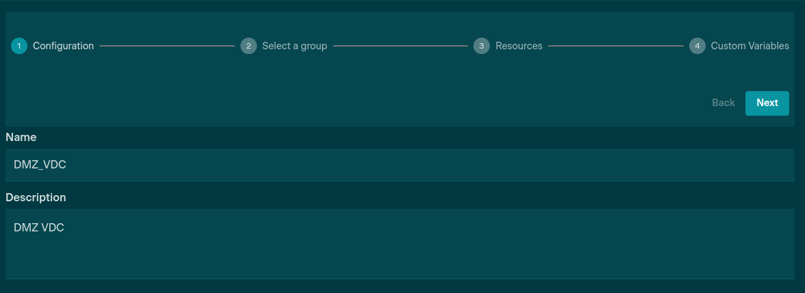 Once the Groups, Users, and Virtual Networks have been set up, the VDCs can be created. The instructions to create the DMZ VDC are detailed below: