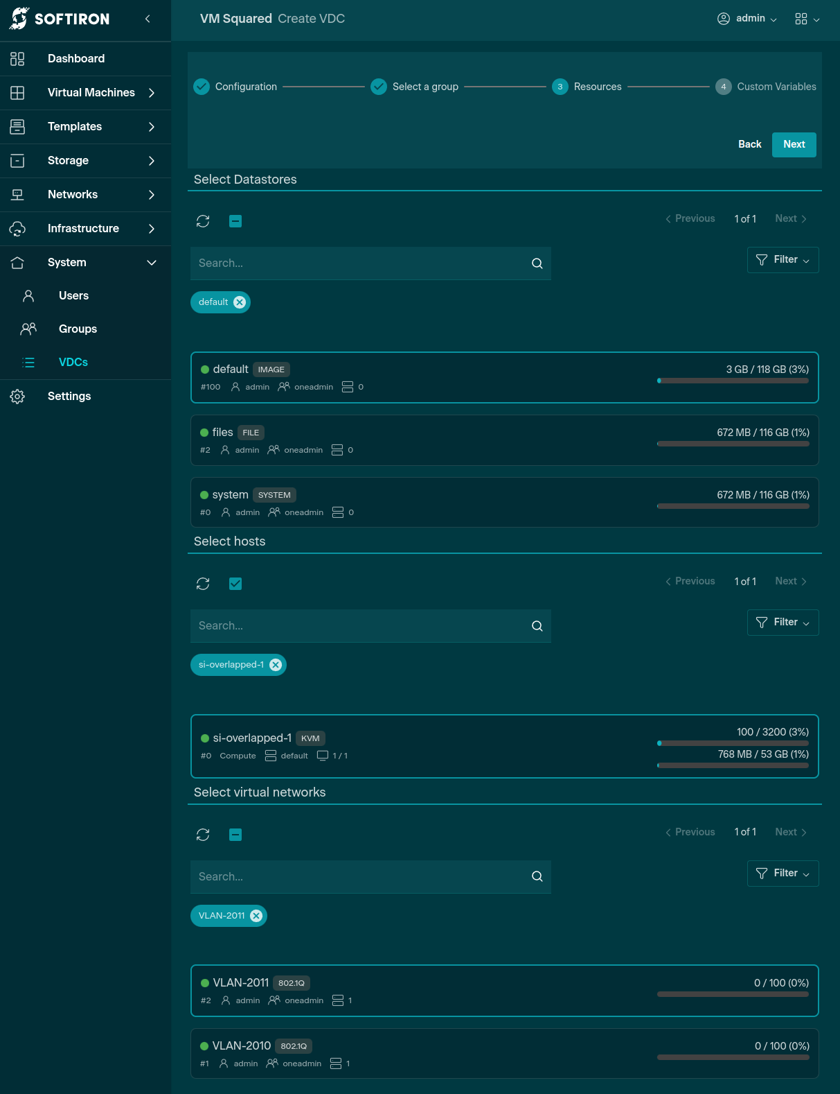 To create a new VDC, navigate to the System → VDCs Menu and click the green + to open the wizard.