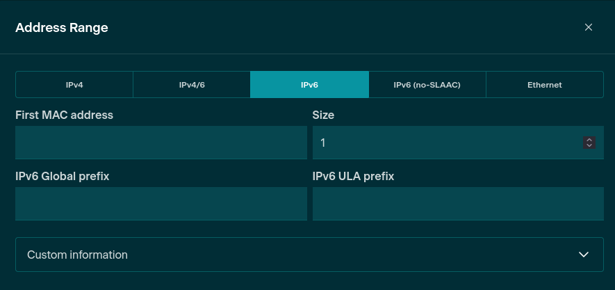 - IPv6 (no-SLAAC) - Only fixed non-global IPv6 addresses are assigned