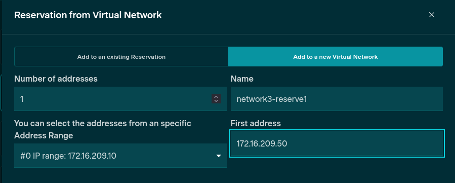 Address Reservations can remove an IP from the available subnet in the defined Address Range. A reservation behaves like a child of an existing Virtual Network containing a subset of the parent Virtual Network's addresses. The addresses in the reservation cannot be used in the parent Virtual Network while they are part of the Reservation.