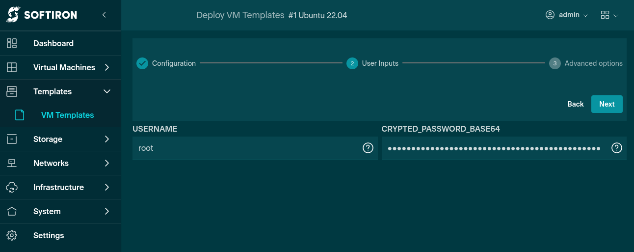 When deploying the VM Template, since additional template context was added, there will be an extra step for User Inputs, this is where the password data is entered for the VM.