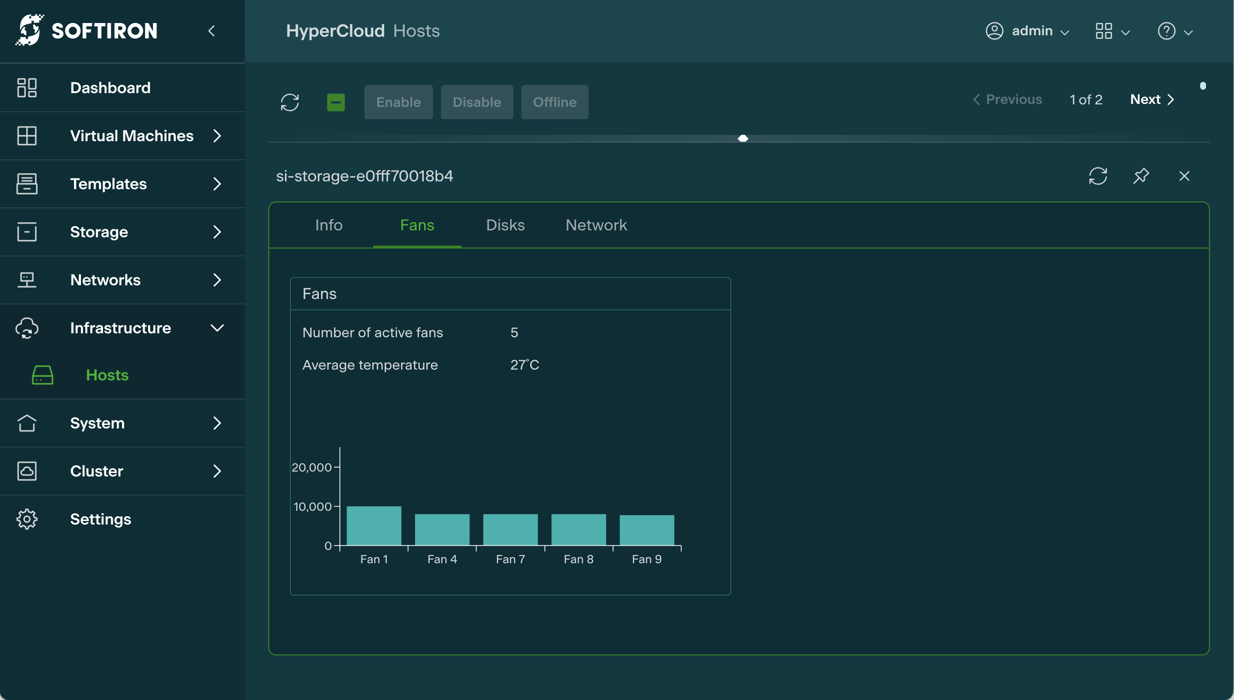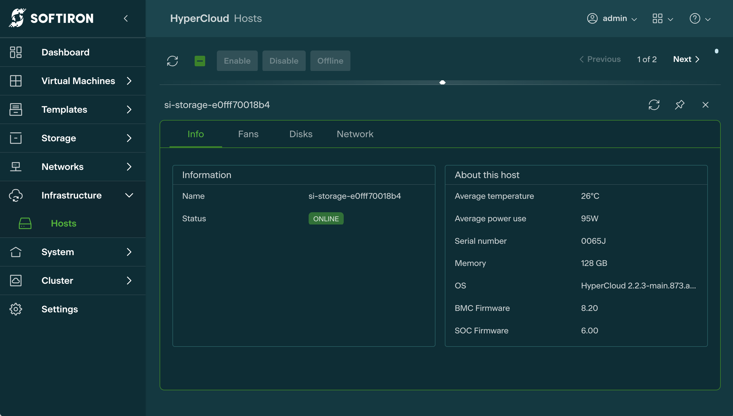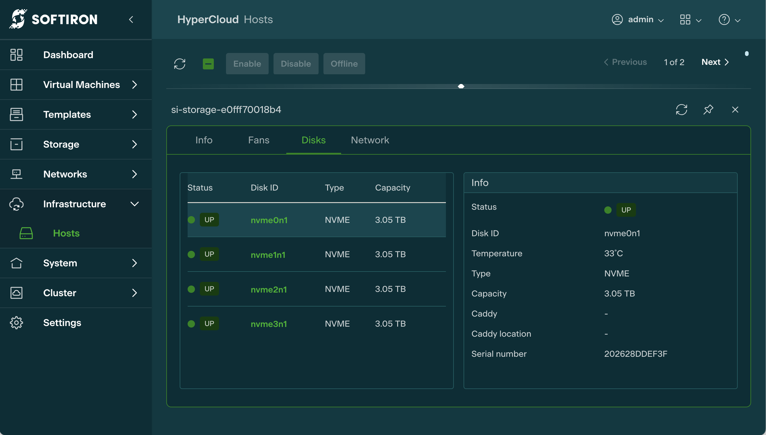 On storage machines the host information panel includes details on each drive including status, serial, size, temperature and location.