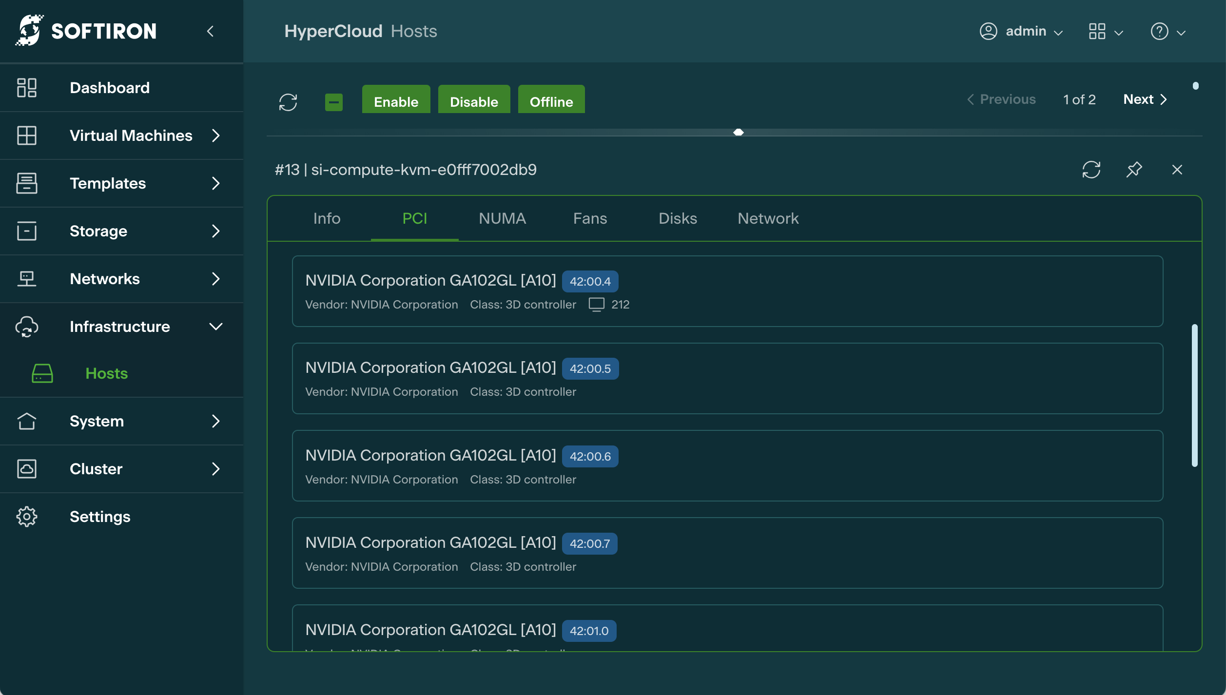 On HyperCloud Intelligent nodes with GPU or AI hardware acceleration the PCI tab shows the card information: vendor, PCIe bus etc.