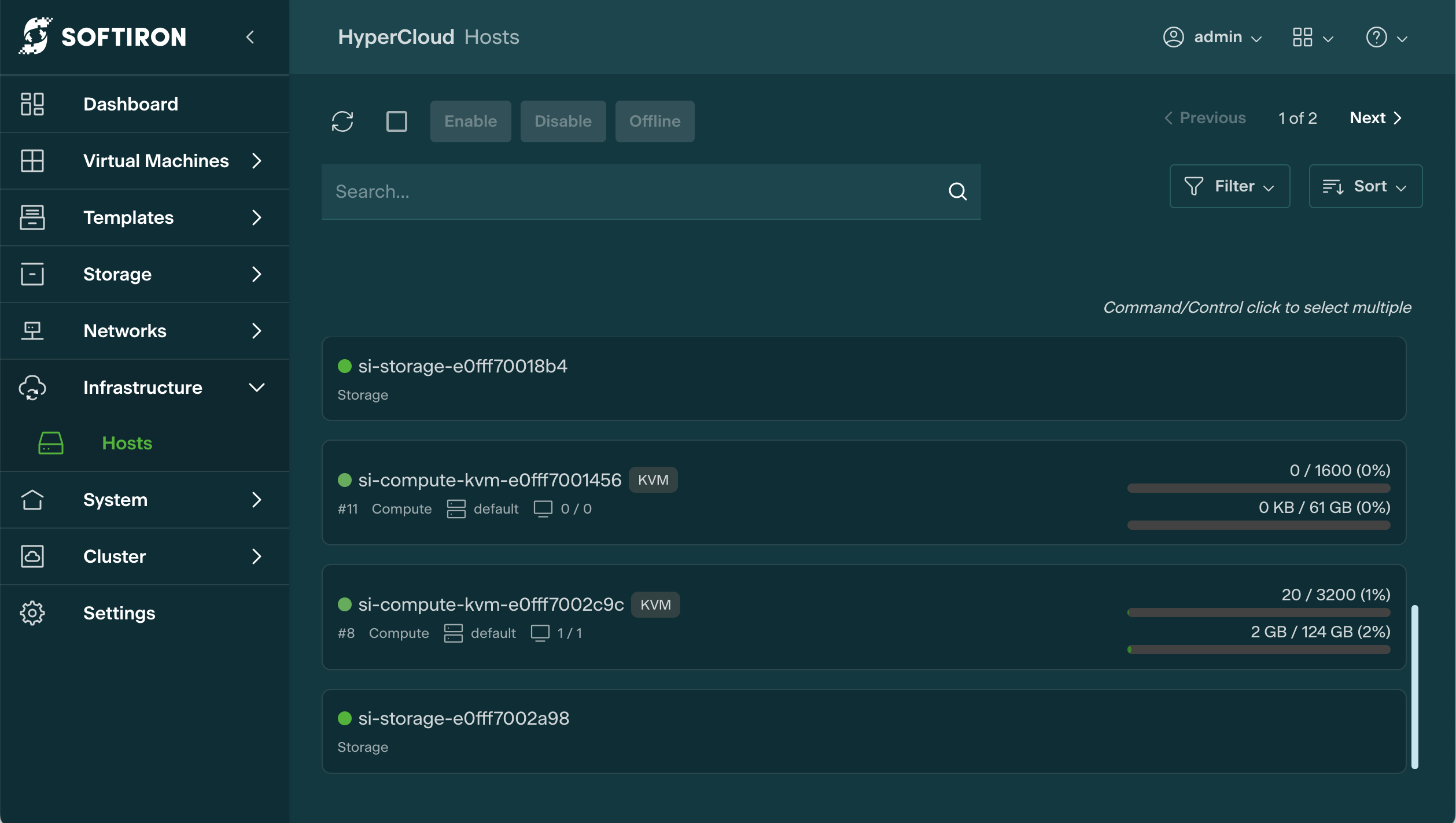 Navigate to the Infrastructure -> Hosts tab on the left of the glasshouse GUI. Each host machine in the cluster is listed, together with it's role and a brief status overview.