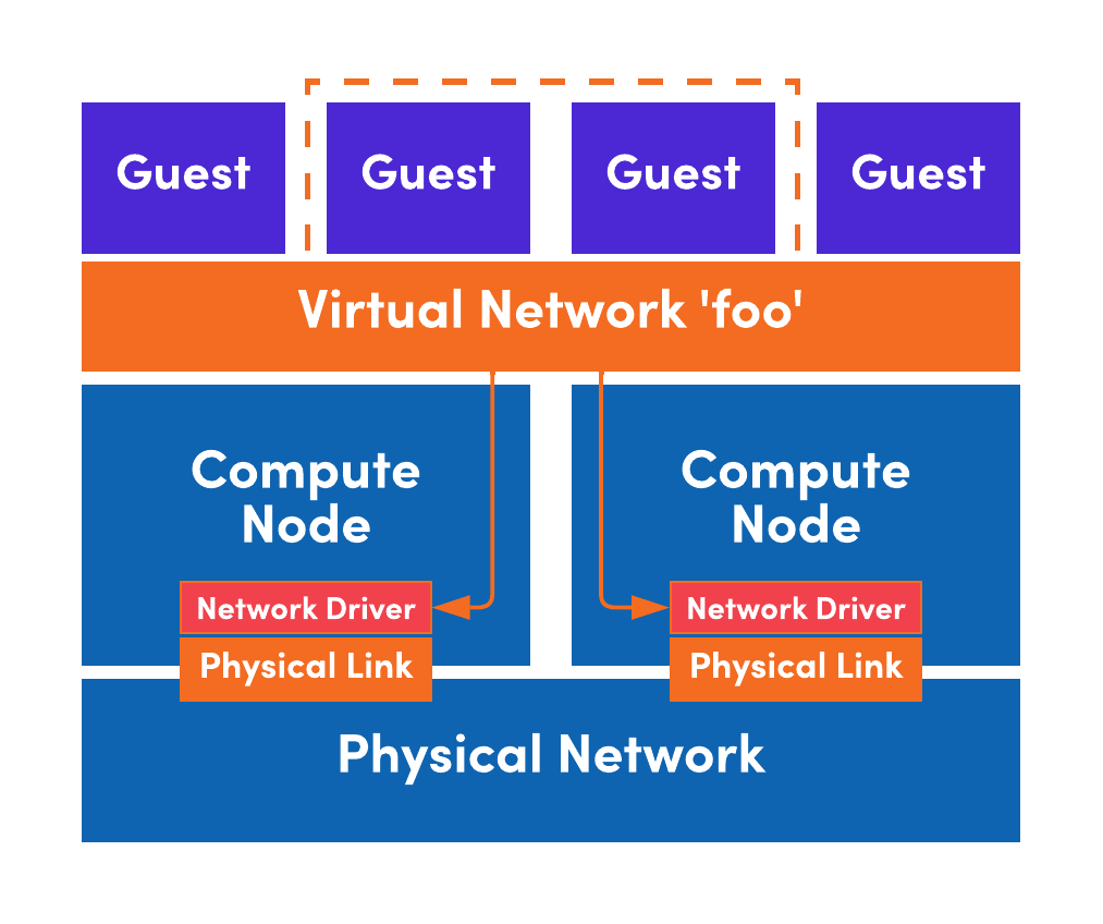 Virtual networks can be created spanning compute nodes to manage the underlying networking of VMs and containers within HyperCloud.
