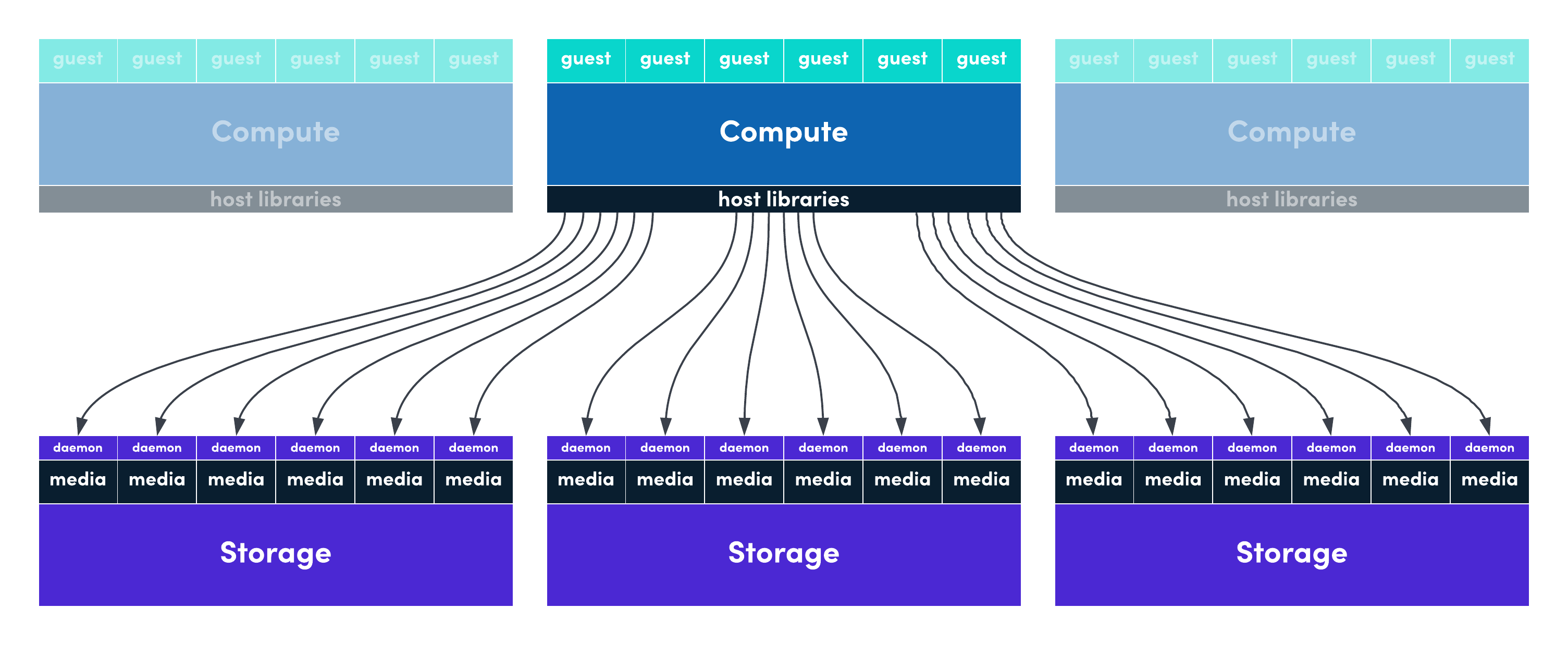 - Mix and match: Due to a diverse set of media available, including HDD, SSD, and NVMe, there are a number of different storage tiers which can be mixed and matched within the same storage layer. These can be exposed to the compute layer as independent datastores.