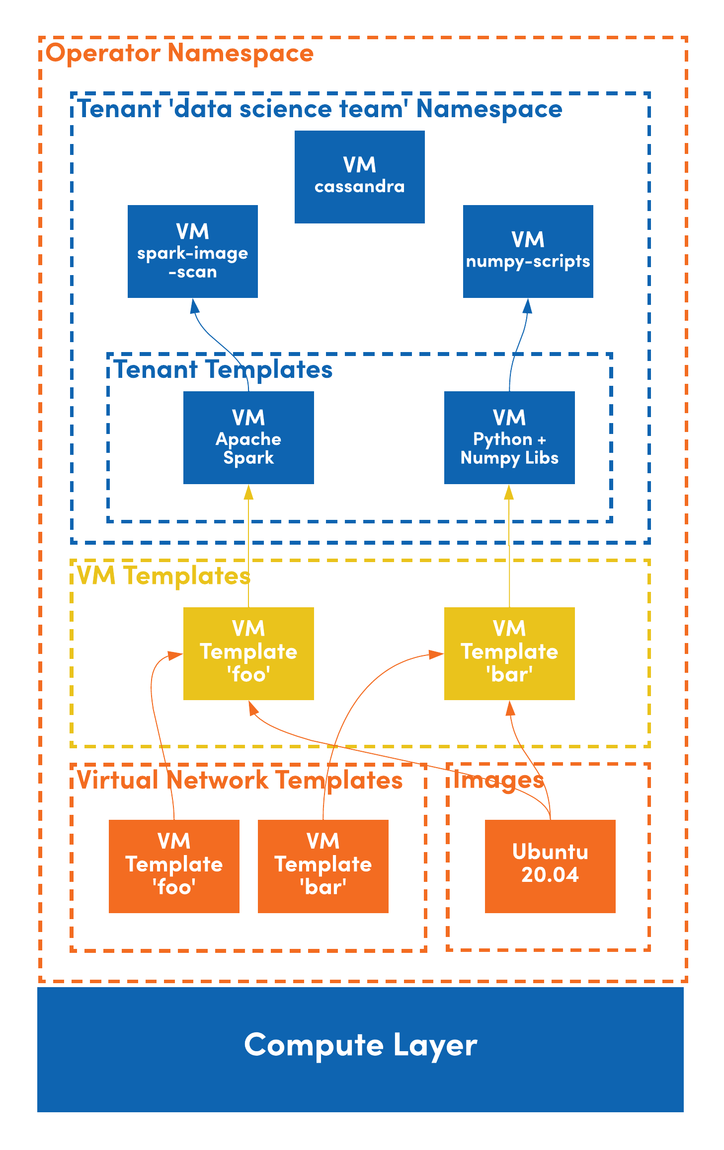 Within a tenant, templates can be created from scratch or inherited and modified from the operator namespace. Operators can build standard VM templates, network templates, and images either across the entire cloud or individually for each tenant.