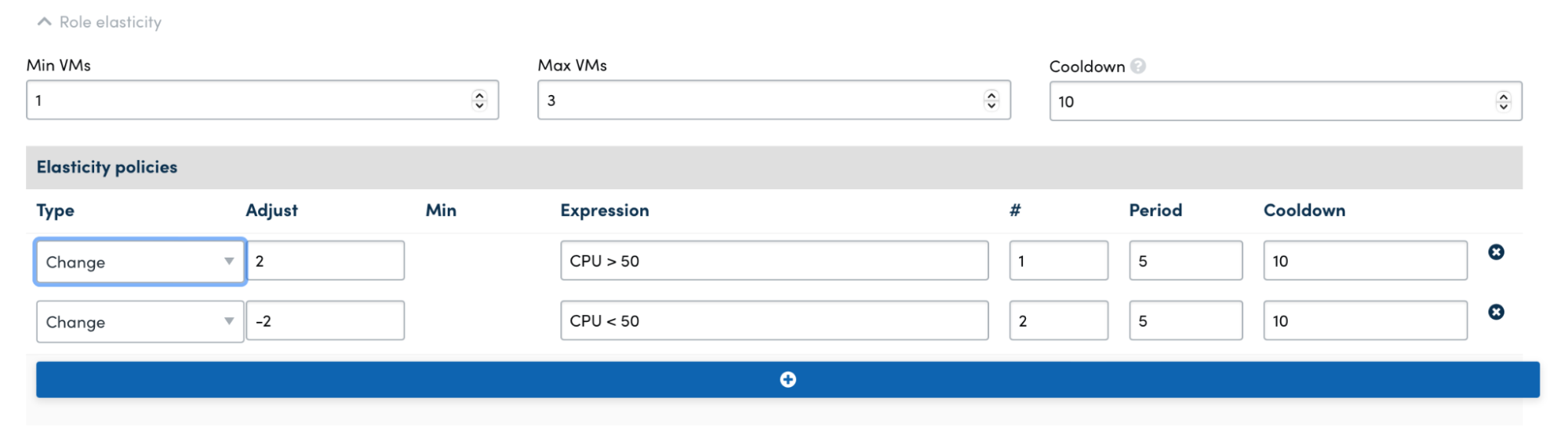 - The # field will be set to 1, which represents the number of periods that the expression must output true before the elasticity is triggered