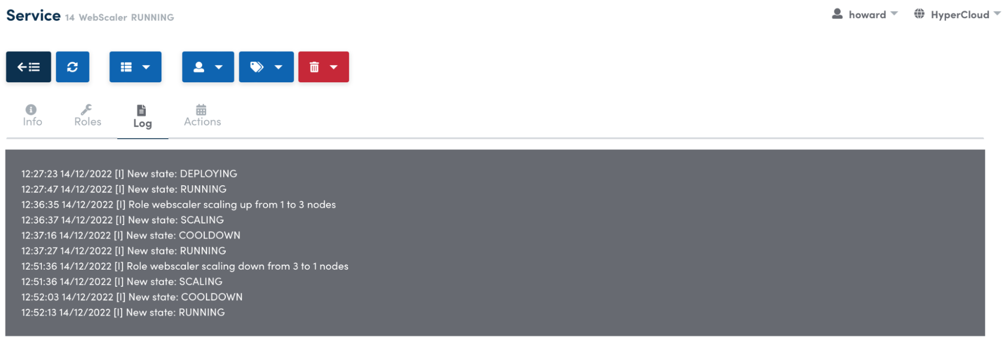 The Log tab displays the archive of the system's scaling and descaling states.