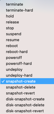 The nomenclature of the commands is such that, snapshot-create refers to the creation of the full VM Snapshot and a disk-snapshot-create refers to a specified disk snapshot that can be converted to an Image that will be saved in the Datastore.