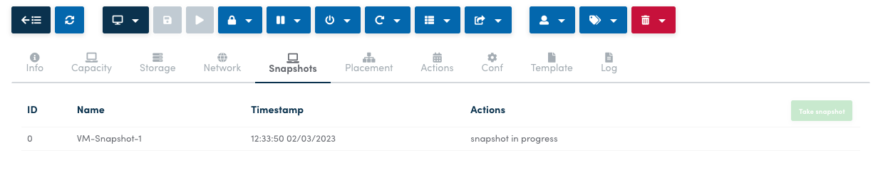 There are several ways of taking and managing snapshots within the GUI and via the CLI. After selecting a VM from the list of running Instances, there will be several tabs of information available to select and view and/or modify. The Storage, Snapshots, and Actions tabs contain the actionable options for the snapshots.