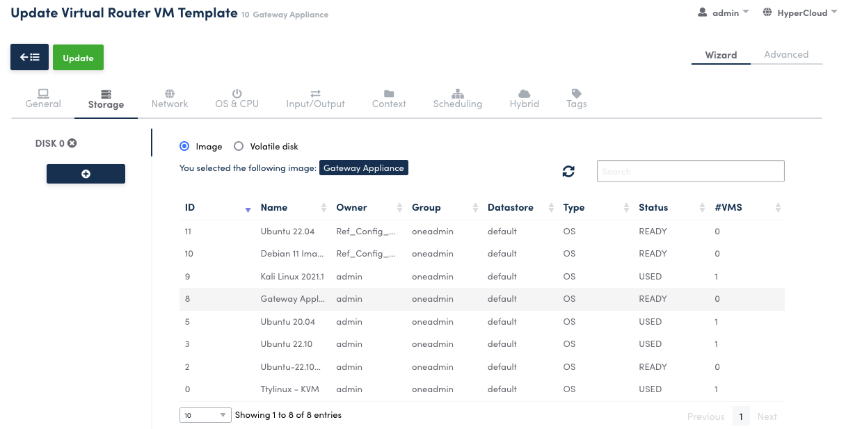 In the Virtual Router Template list, select the newly created Gateway Appliance, switch back to the Wizard, and enter the Storage section on the ribbon. Here, the Gateway Appliance Image can be selected to load as a Disk on the Template.