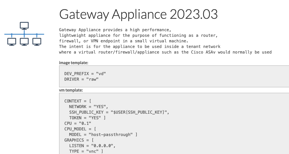 The Gateway Appliance has now been successfully downloaded from the HyperCloud Marketplace WebGUI and a Template has been created to use on the HyperCloud infrastructure. For details on the device, refer to Gateway Appliance