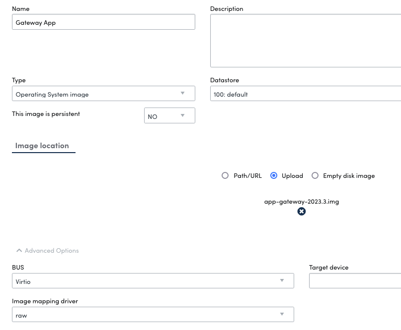 From the dashboard, navigate the GUI to create an image, and enter the necessary information to upload the image to the desired datastore.
