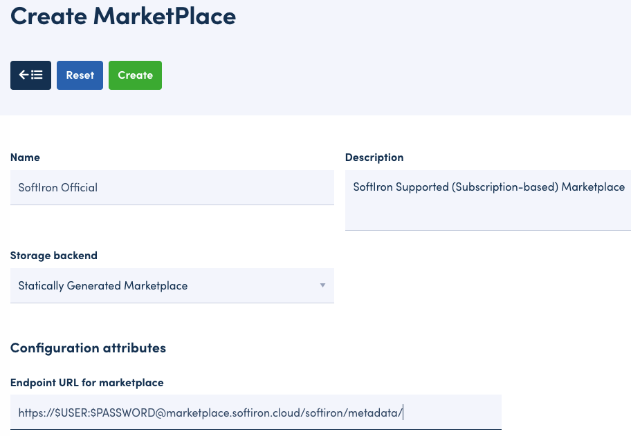 The Configuration Attribute field for the SoftIron Marketplaces requires URL endpoints for each marketplace and the SoftIron sponsored marketplaces are listed below: