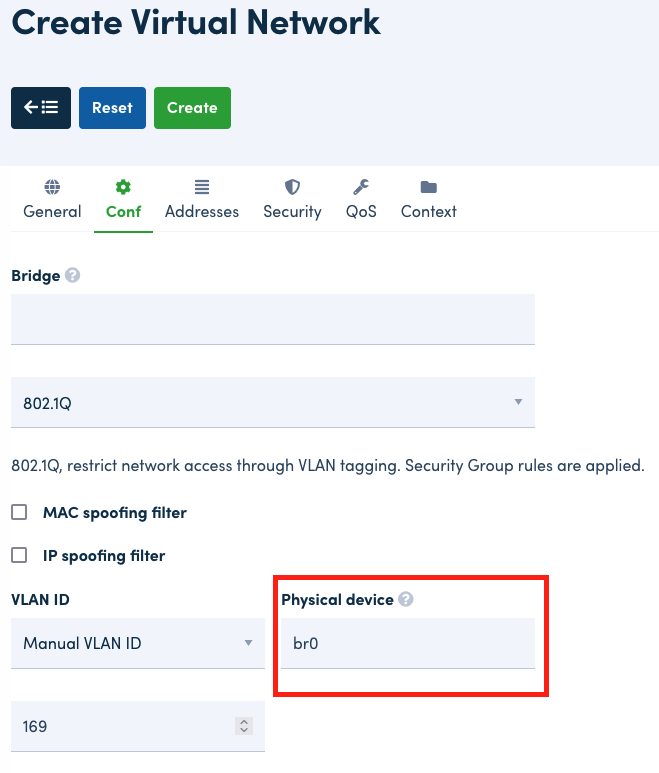 When creating a VNet, the platform requires a Physical Device entry, for this field, enter br0. Also, the VLAN ID should be set to Manual and given the desired identification number.