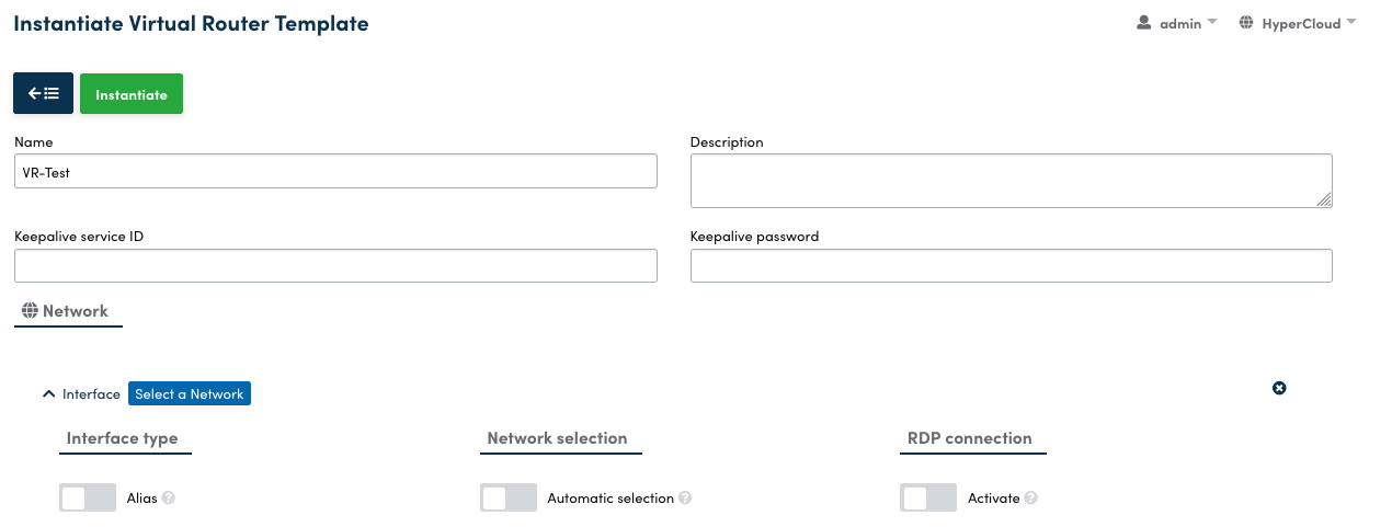 - Click green Instantiate button to finish the setup and HyperCloud will create the Virtual Router and the Virtual Machines automatically.