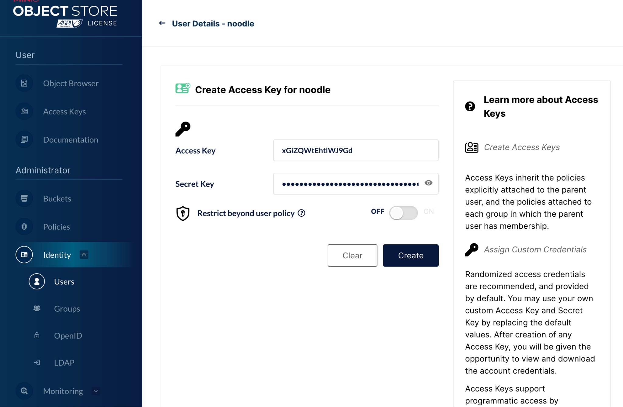 Create Access Key for user. This will create an Access Key and Secret - the secret will only be shown once during this creation process but there is an option to download it. It can not be recovered if it is not recorded or saved at this point. The Access and Secret Keys can now be loaded into the client's ~/.s3cfg file.